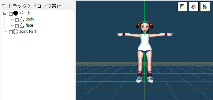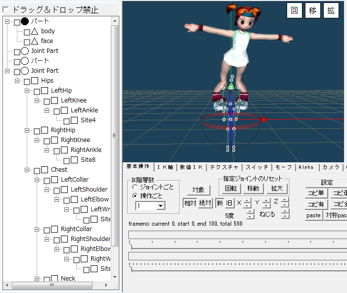 マウスで3Dウインドウ上の○マークをマウスでドラッグして姿勢を変えてうまく動くかを確認します。
