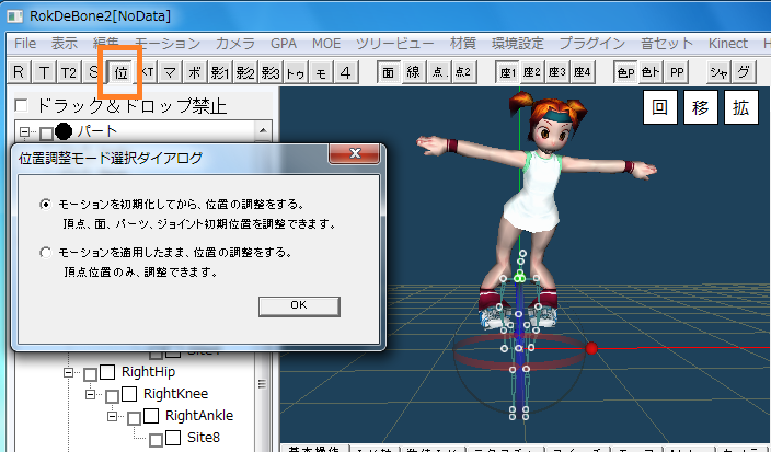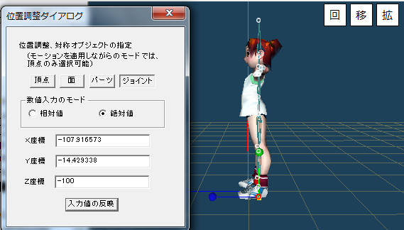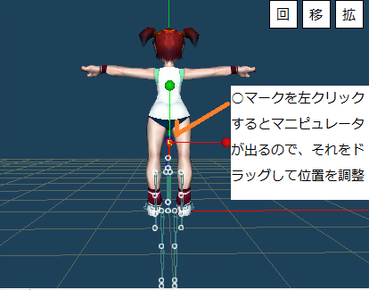 位置調整は3Dウインドウ上の○マークのマウスドラッグとダイアログでの数値指定に対応しています。