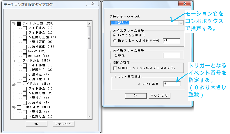 どのイベント番号でモーションの分岐が起こるかを指定します。