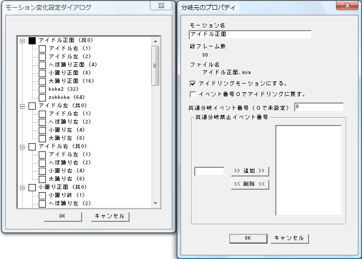 例えば、「アイドル右」というモーションに共通分岐イベント番号1を設定したとします。