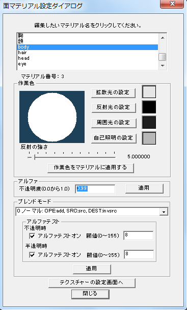 マテリアル名をクリックしても設定ダイアログが出ない場合は、もう一度クリックしてください。