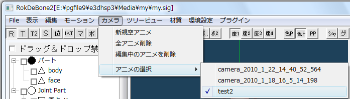 複数のアニメの切り替えはメインウインドウのカメラメニューで行います。