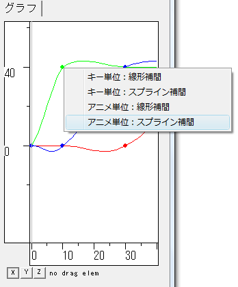 グラフウインドウではキー間の補間計算方法を設定できます。