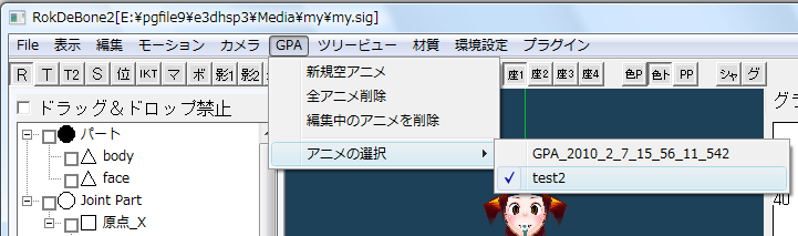 「アニメの選択」メニューでアニメの名前を選ぶとそのアニメを編集再生保存出来るようになります。