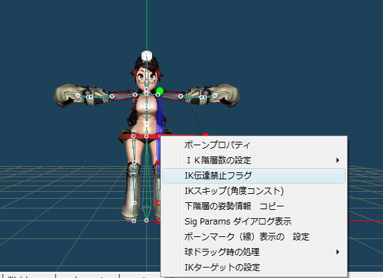 IK伝達禁止フラグを設定するには設定したいジョイントをマウスで右クリックしてIK伝達禁止フラグのメニューにチェックを入れます。