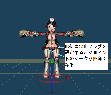 まずモデルを読み込んだら足の付け根に「IK伝達禁止フラグ」を設定します。