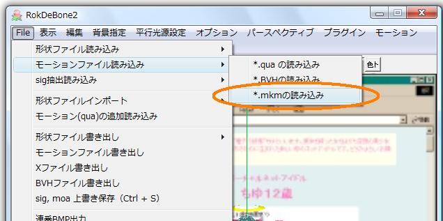 mikoto形式のmqoを読み込んだ状態で、Fileメニューから「モーションファイル読み込み」の「*.mkmの読み込み」を選択します(図1)。