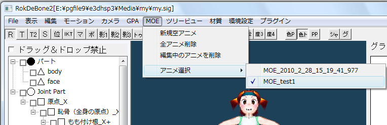 アニメの切り替えはメインウインドウの「MOE」メニューで行います。