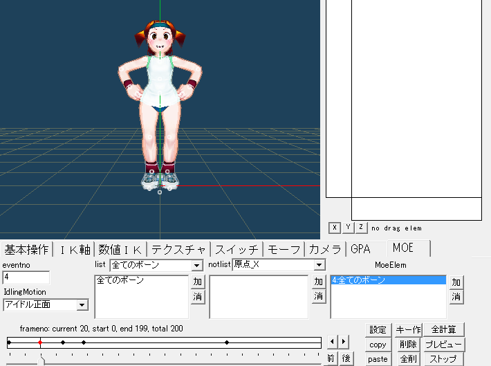 基本操作タブでのモーション単体のプレビューをしたいときは、キーが一つもないMOEアニメをMOEメニューで選択しておきます。