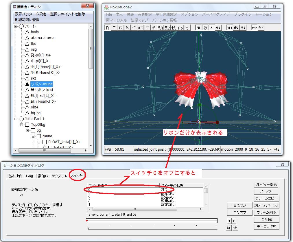 するとスイッチ0でないパーツだけが表示されます。今回の場合はスイッチ1のリボンだけが表示されます。