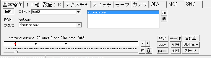 タイムスライダーを動かし、効果音を選び、「加」ボタンを押すとキーが作成されます。