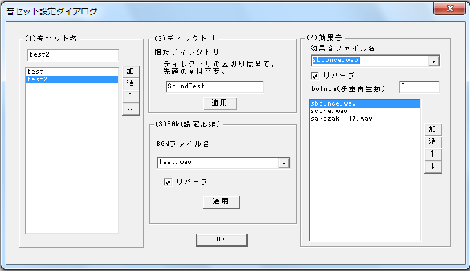 ダイアログの(1)音セット名、(2)ディレクトリ、(3)BGM、(4)効果音の順番で設定していかないとうまくいきません。