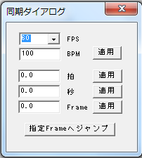 同期ダイアログ(図6)に拍、秒、フレームいずれかを記述して適用ボタンを押した後ジャンプボタンを押すと