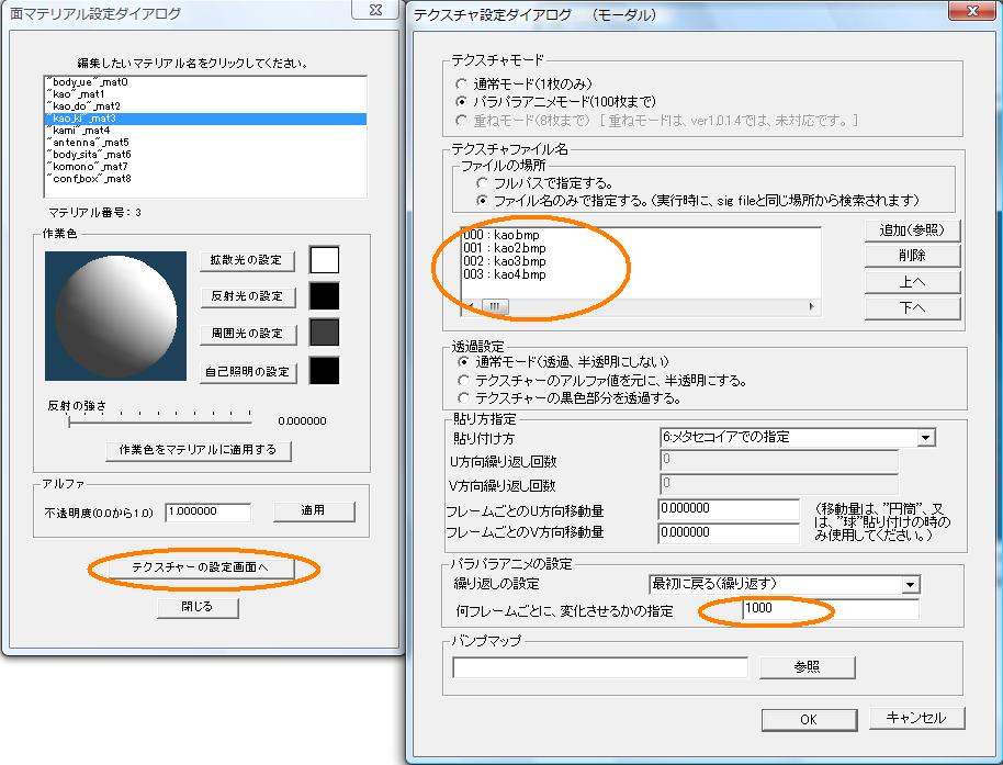 このダイアログで「テクスチャモード」を「パラパラアニメモード」にします。