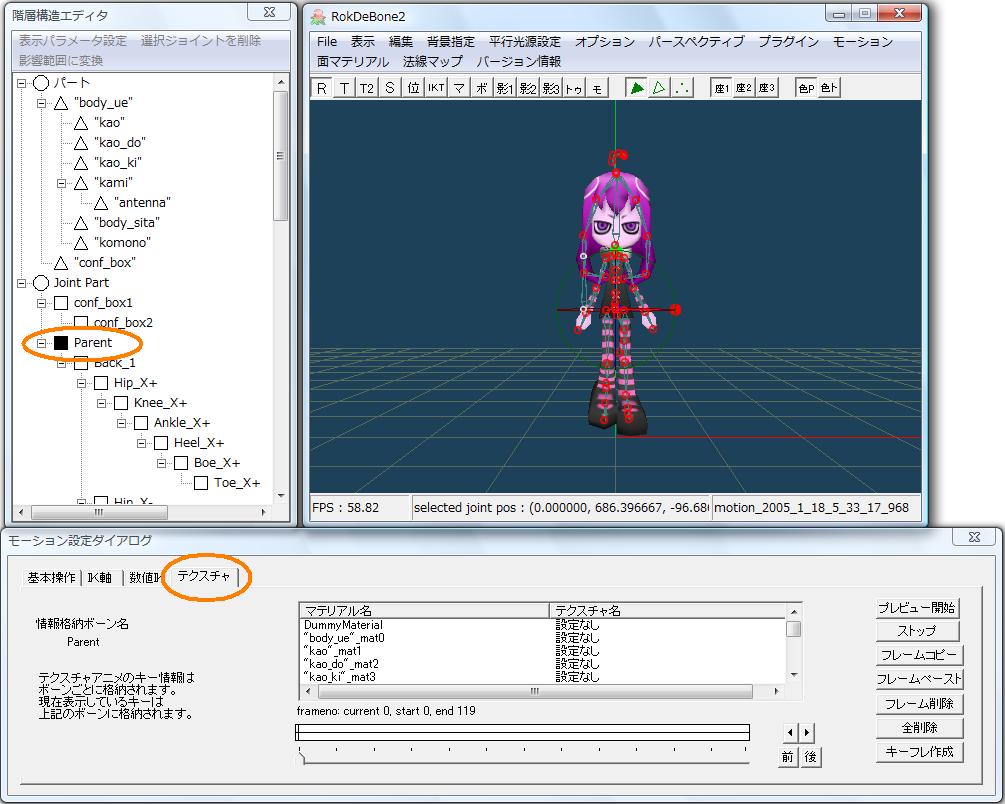 階層構造エディタでキーを格納するボーン名をクリックしてから、モーションダイアログの「テクスチャ」タブをクリックすると