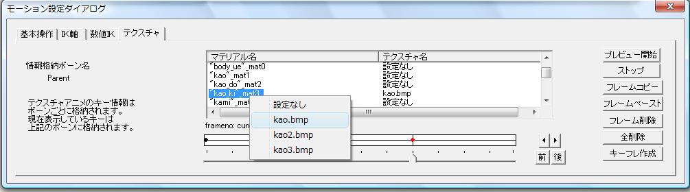 現在のフレーム番号の時に表示したいテクスチャ名をマウスで選択してください。