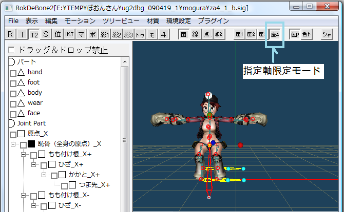 図2は足のIKの軸が「座1」のX軸になるように設定し、同じ操作をしたときの図です。