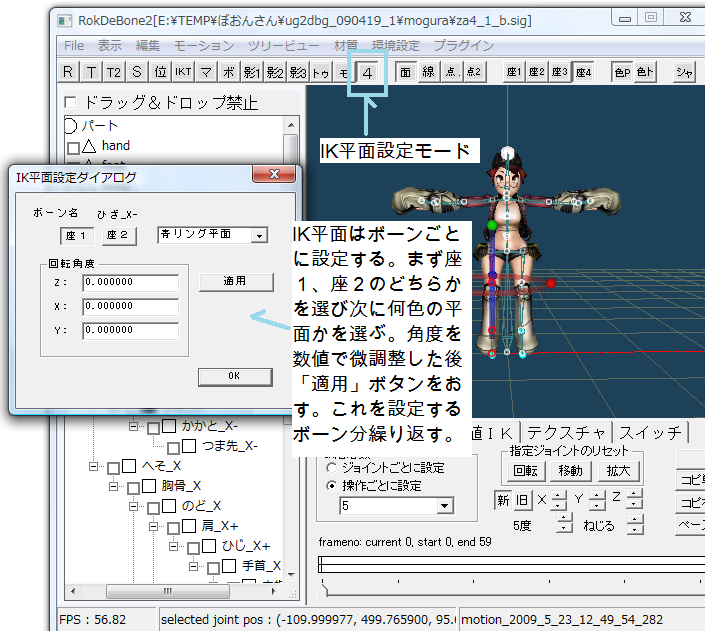 設定したいボーンをマウスでクリックして「IK平面設定ダイアログ」の「座1」か「座2」を選びます。